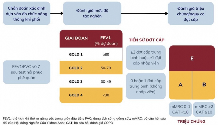 Về phân loại giai đoạn COPD, tương tự như GOLD các năm trước đó, GOLD 2023 vẫn đánh giá mức độ tắc nghẽn đường thở gồm 4 mức độ từ nhẹ (GOLD 1) đến rất nặng (GOLD 4) dựa trên chỉ số FEV1 sau nghiệm pháp hồi phục phế quản. Về phân nhóm COPD, GOLD 2023 có thay đổi khi gộp nhóm C và nhóm D thành nhóm E để làm nổi bật sự liên quan lâm sàng của các đợt cấp như hình dưới đây: