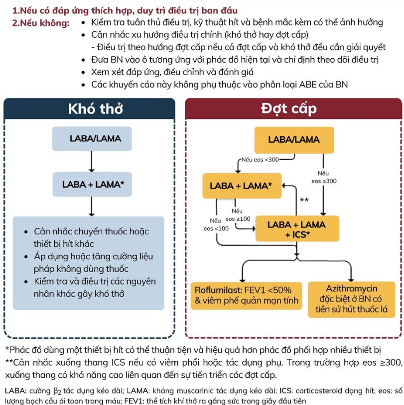 Sau đó các bệnh nhân sẽ được tiếp tục đánh giá tại các lần tái khám dựa trên triệu chứng, mức độ khó thở và số đợt cấp cũng như kĩ thuật sử dụng các dụng cụ phân phối thuốc và các điều trị không dùng thuốc để từ đó cân nhắc tăng, giảm mức điều trị hay thay đổi thuốc hoặc dụng cụ hít khác. Biểu đồ theo dõi điều trị bằng thuốccủa GOLD 2023 sau đây hướng dẫn sự thay đổi trong phác đồ điều trị của các bệnh nhân với các biểu hiện lâm sàng cụ thể: