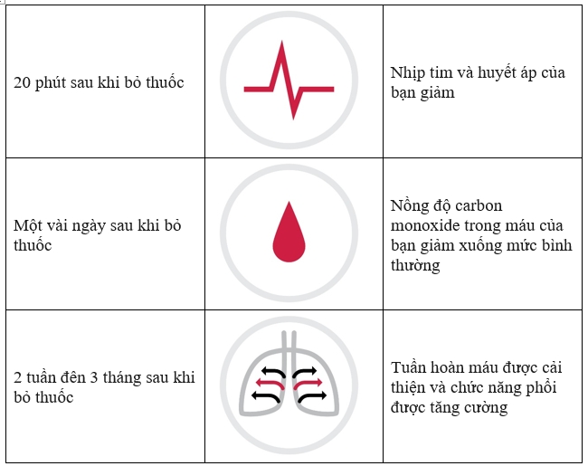 Chỉ vài phút sau khi hút điếu thuốc cuối cùng, cơ thể người hút thuốc sẽ bắt đầu phục hồi. Nghiên cứu của Tổ chức American Cancer Society đã chỉ ra một số lợi ích sức khỏe khi bỏ thuốc lá hoàn toàn.