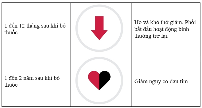 Người bỏ hút thuốc lá được 1 năm, nguy cơ mắc bệnh tim mạch vành của một người giảm 50%. Rủi ro này sẽ tiếp tục giảm qua các mốc 1 năm.