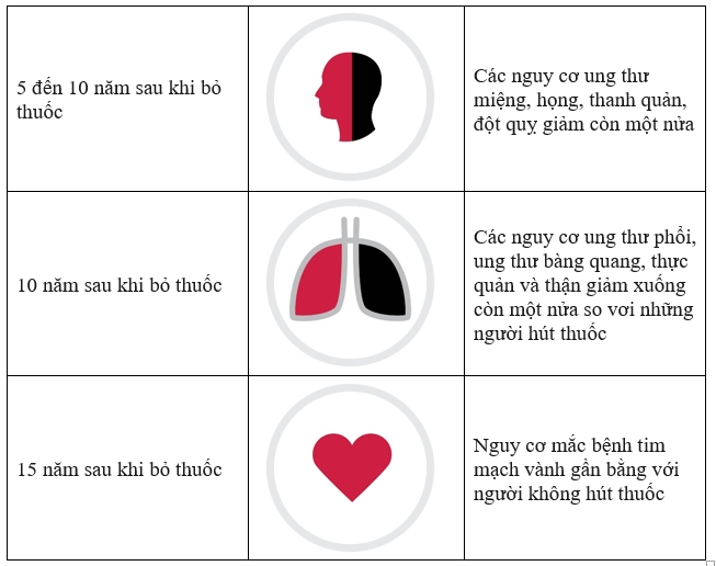 Từ bỏ thuốc lá sau 10 năm, nguy cơ phát triển ung thư phổi và tử vong do ung thư phổi của một người gần như giảm một nửa so với một người tiếp tục hút thuốc. Khả năng phát triển bệnh tim mạch vành của người đã ngưng hút thuốc 15 năm tương đương với người không có tiền sử hút thuốc.